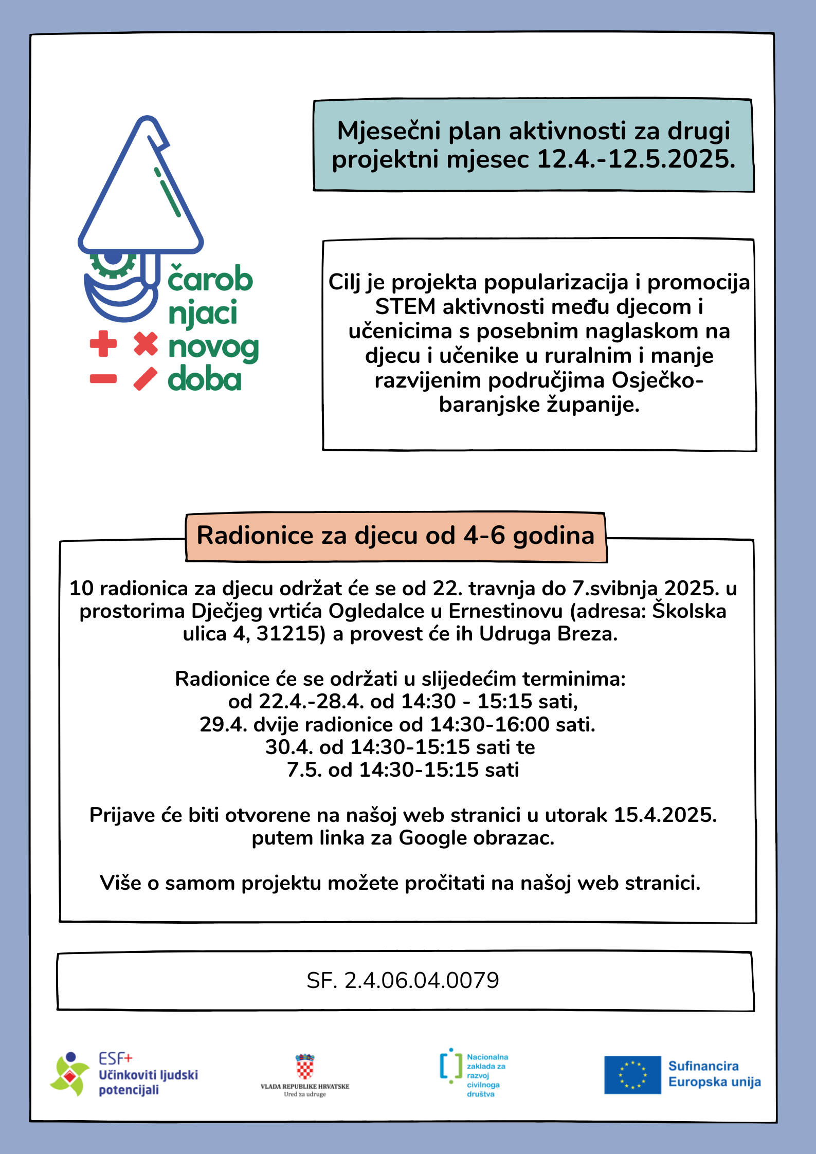 Projekt Čarobnjaci novog doba SF.2.4.06.04.0079 čiji nositelj je Udruga Breza ušao je u drugi provedbeni mjesec! Nakon izuzetno uspješno provedenog prvog mjeseca i 10 radionica održanih u DV Cvrčak, s veseljem dostavljamo novi mjesečni plan aktivnosti. U drugom projektnom mjesecu planirano je održati 10 radionica od 22.4. – 7.5. u prostorima Dječji vrtić Ogledalce Ernestinovo (Školska ulica 4, 31215). Termini održavanja su od 14:30 – 15:15 sati.